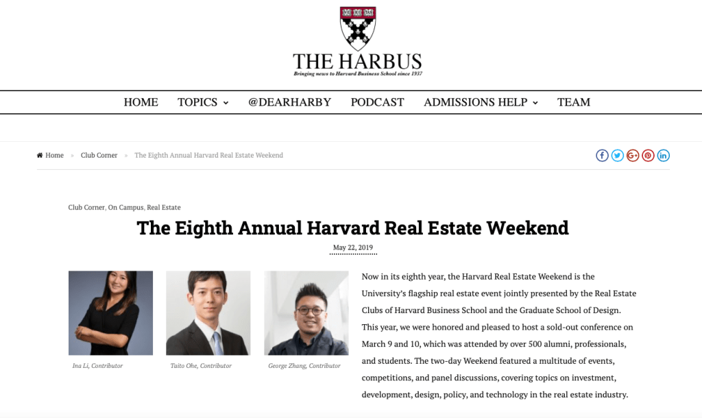 Jointly hosted by the Real Estate Clubs of HBS and GSD, the Harvard Real Estate Conference is the university’s flagship annual real estate event. The 2019 Conference sold out for the first time to 500+ audiences (cap of GSD’s Piper Auditorium).