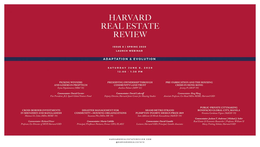 The AY 19-20 Editorial Board of the Harvard Real Estate Review is pleased to present our recently published 8th annual issue, entitled “Adaptation and Evolution.” In lieu of our traditional in-person launch party, the remote nature of all communications these days has enabled us to gather our editors, authors, and commentators under the same “roof,” curating a series of moderated discussions that both reflect and celebrate the published articles and contemplate their current relevance. We were fortunate enough to draw a live audience of nearly 90 people from near and far, and we had the pleasure of welcoming some highly esteemed members of the Harvard real estate community – including Professor Bill Poorvu – as well as our inaugural executive editors from back in 2012.